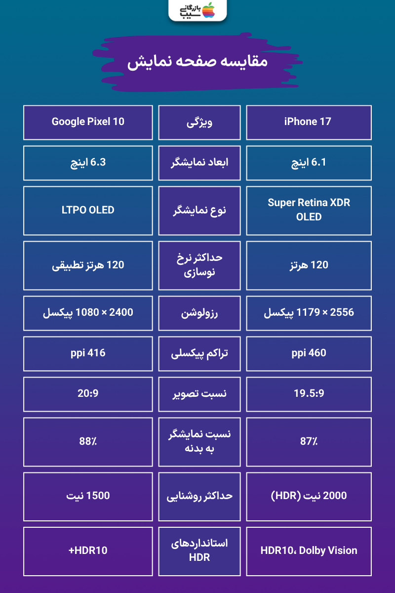 - مقایسه صفحه نمایش آیفون ۱۷ با گوگل پیکسل ۱۰
