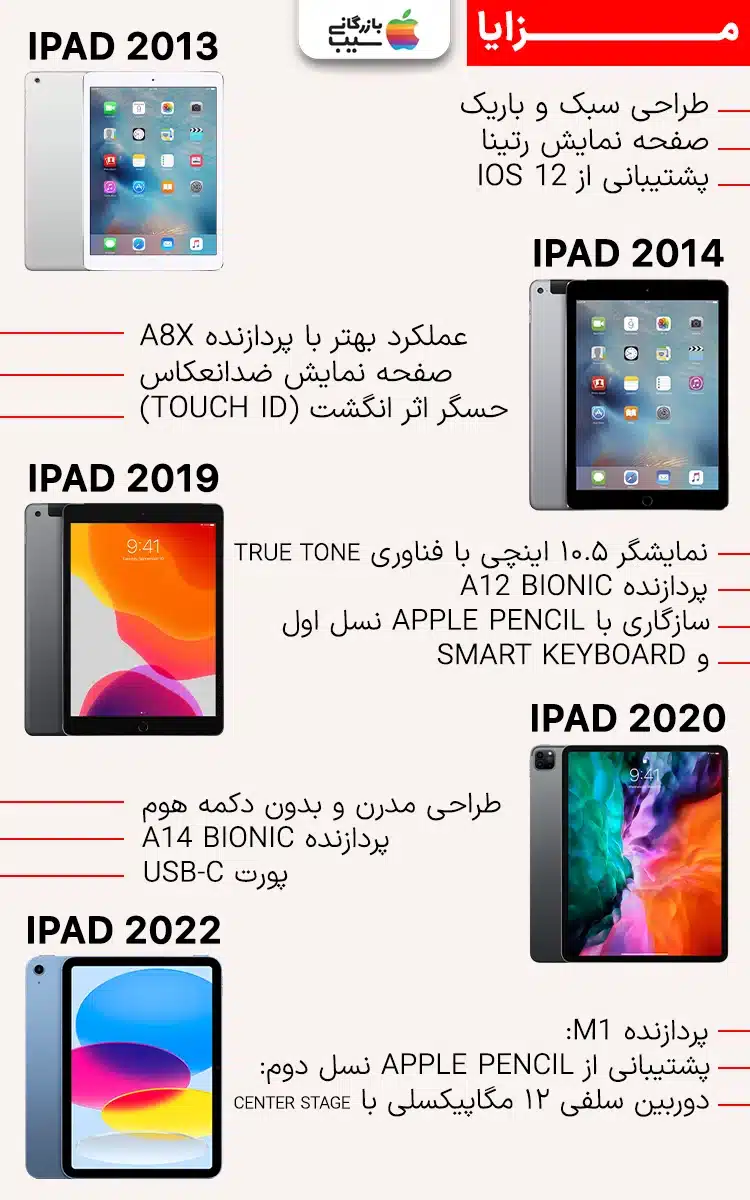اپل تاکنون چندین نسل از آیپد ایر را معرفی کرده که هرکدام نسبت به نسخه‌های قبلی، ارتقاهای قابل‌توجهی را ارائه داده‌اند. در ادامه، نگاهی به مدل‌های مختلف آیپد ایر و ویژگی‌های برجسته آن‌ها خواهیم داشت.